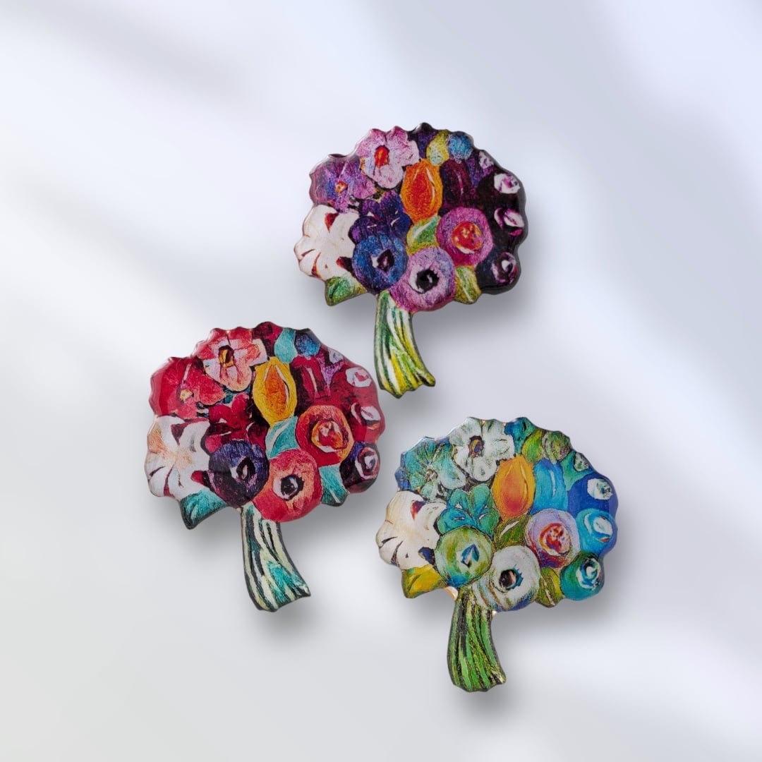 オリジナルイラストを樹脂で硬化させて形成して、UVカット効果のあるの艶仕上げを施し軽量で艶やかなブローチに仕上ました。