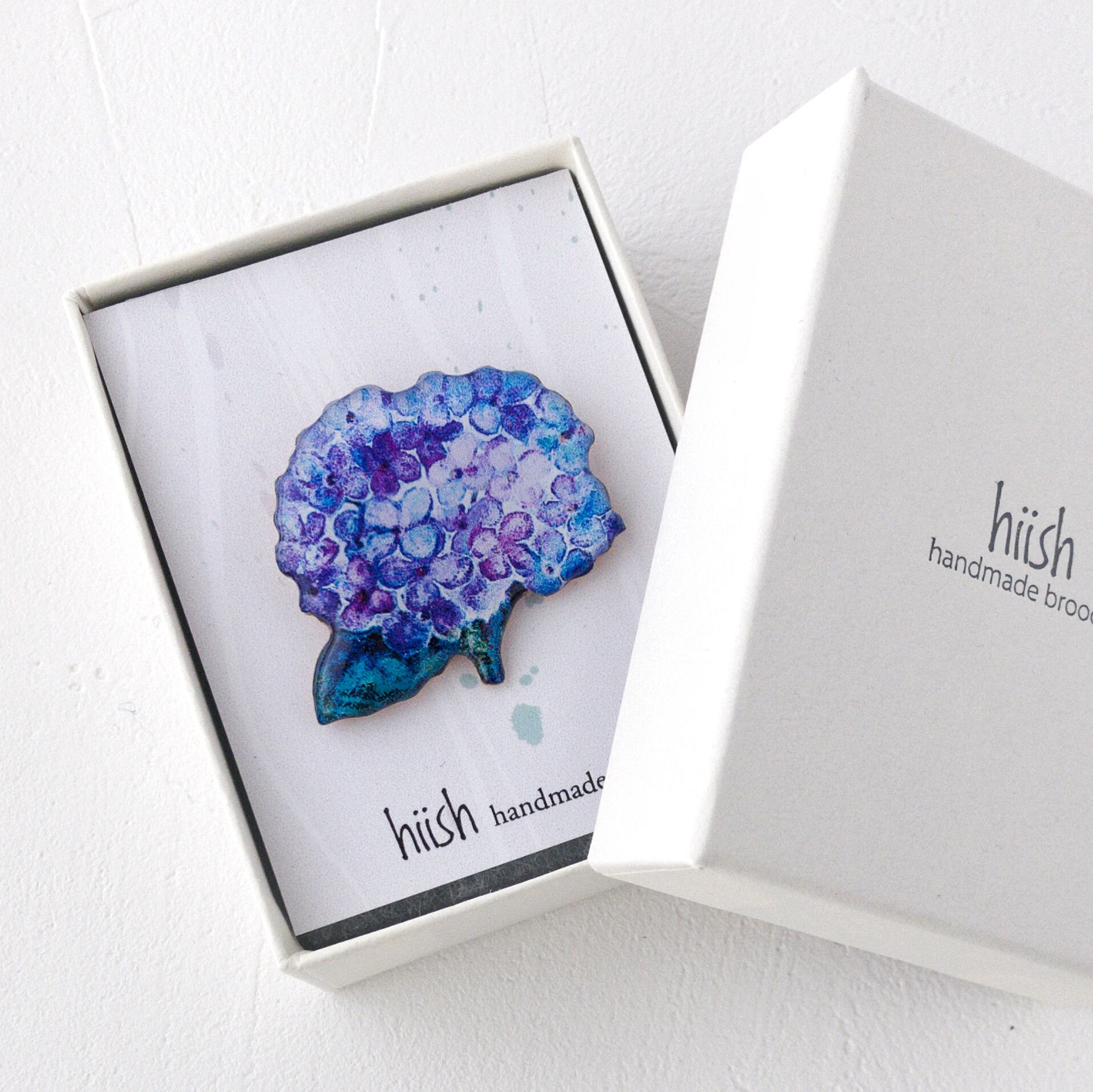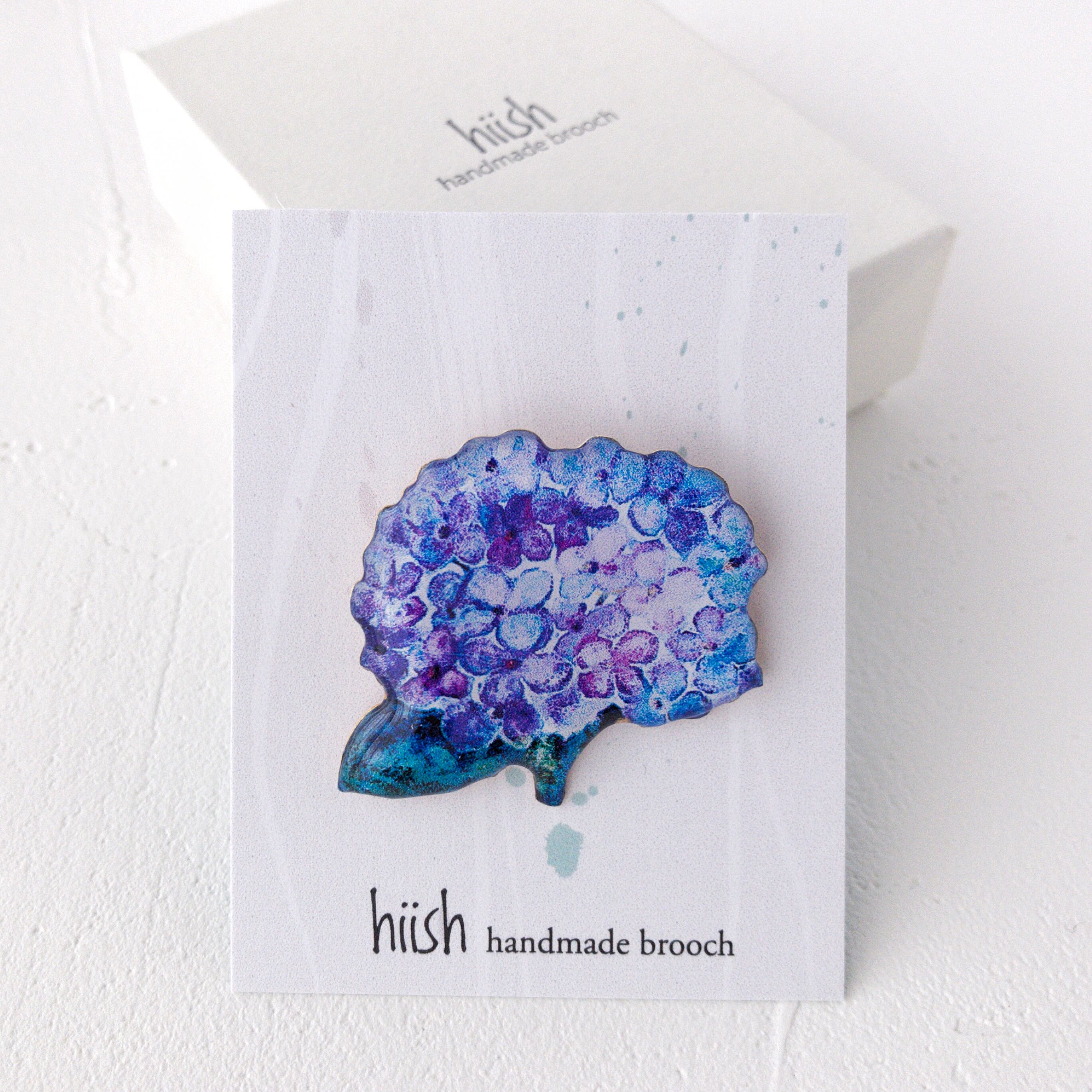 少し前の暑さが嘘のように、涼やかな雨と曇り空に取って代わり盛夏の前の少しアンニュイなひと時です。紫陽花の花のブローチです。