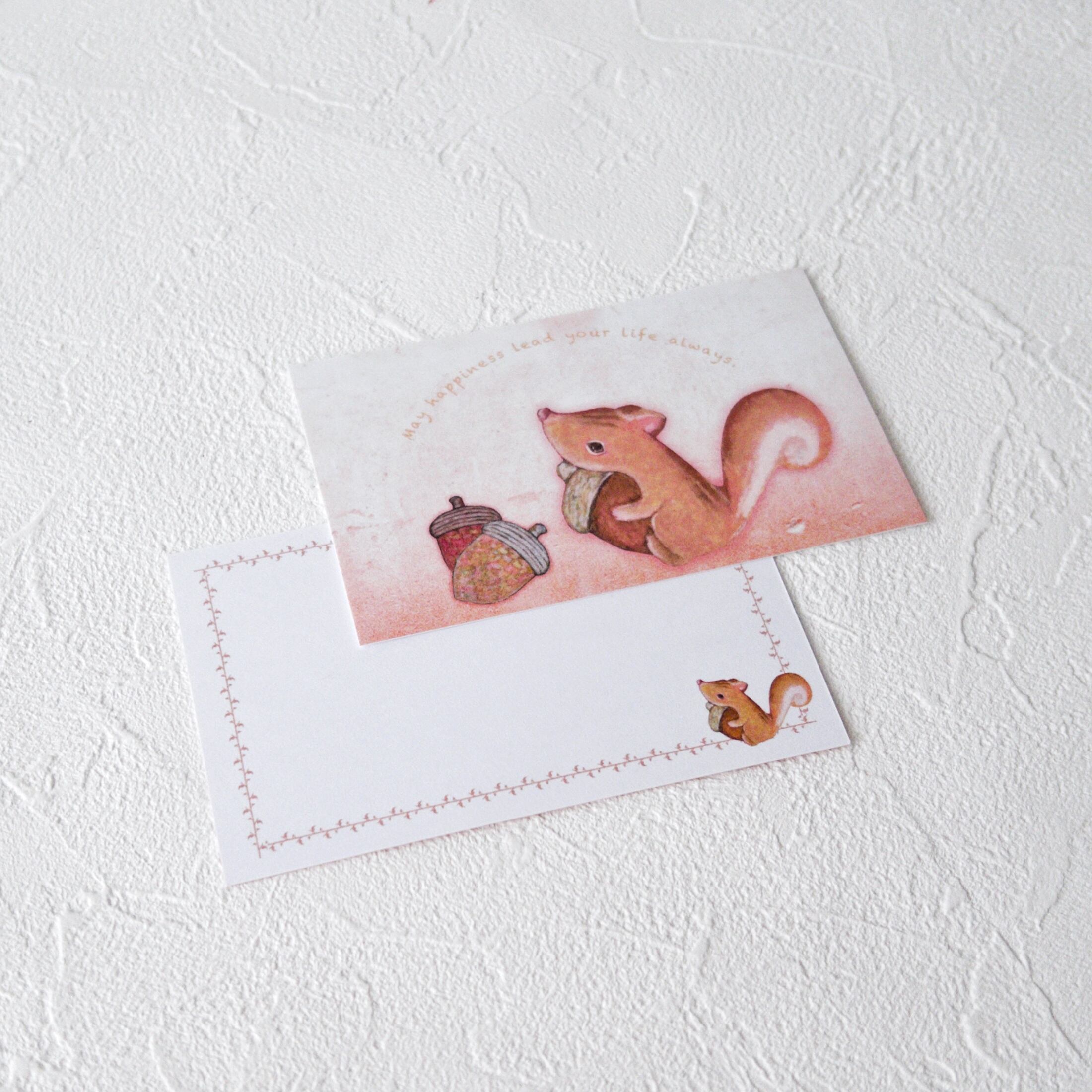 秋の子リスとどんぐりの温かい優しい感じのメッセージカードと封筒のセットです。