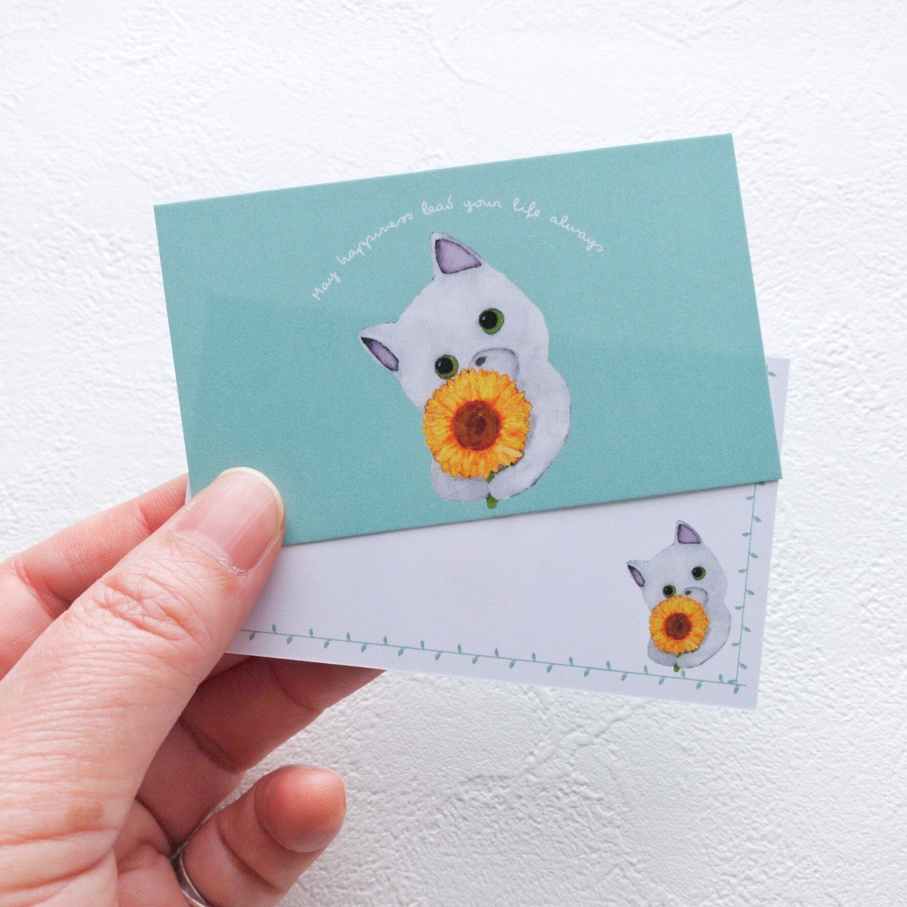 向日葵を抱えた子猫のイラストのメッセージカードセットです。