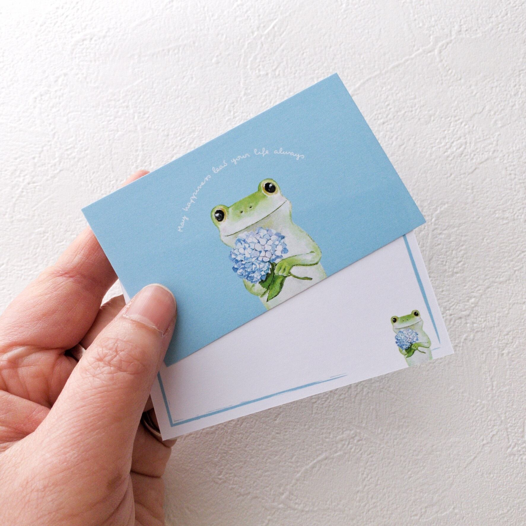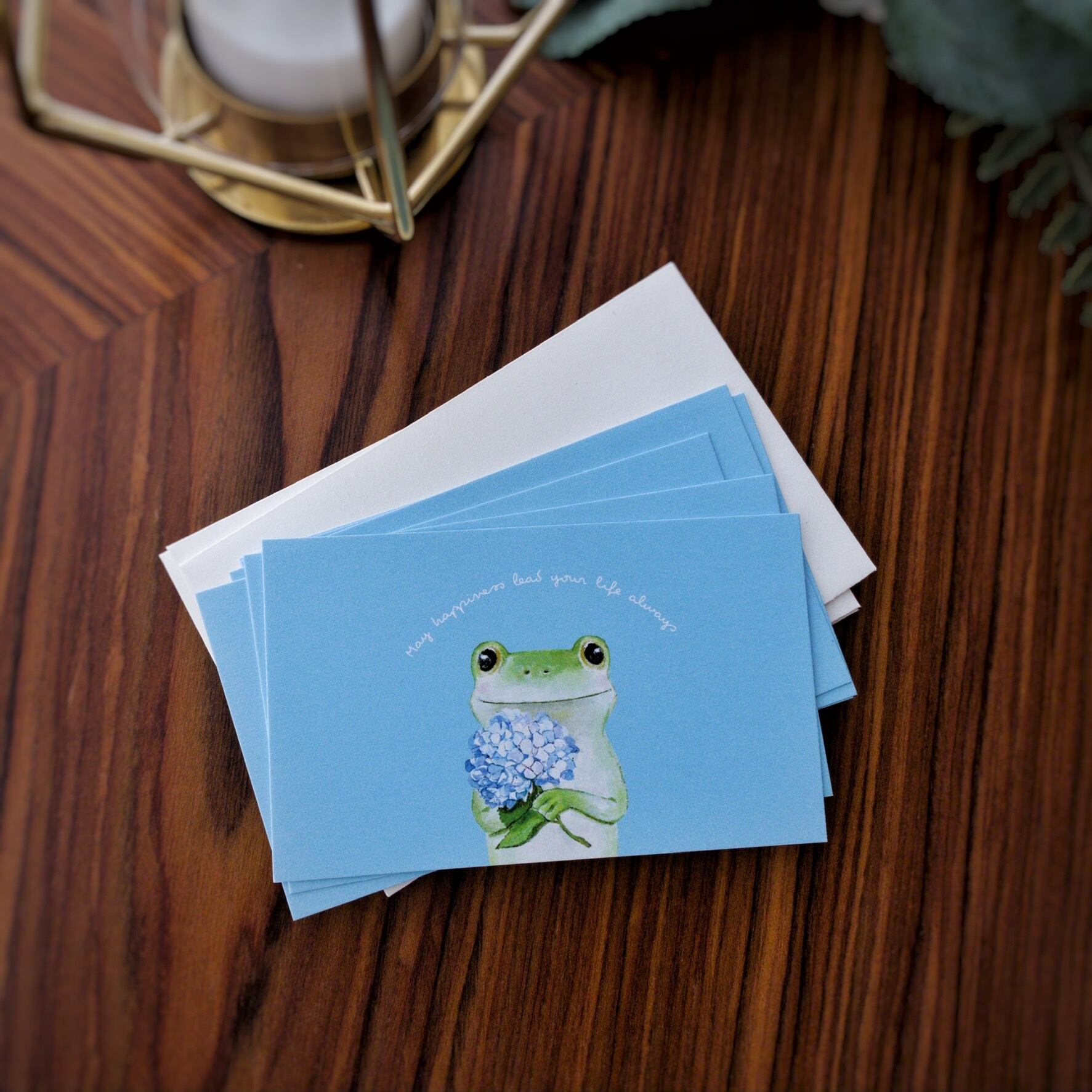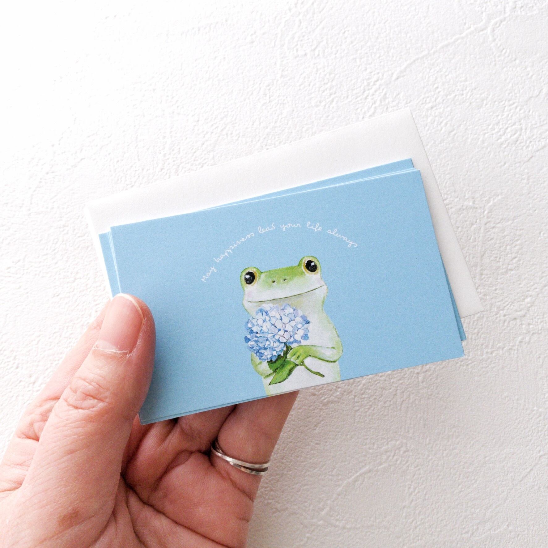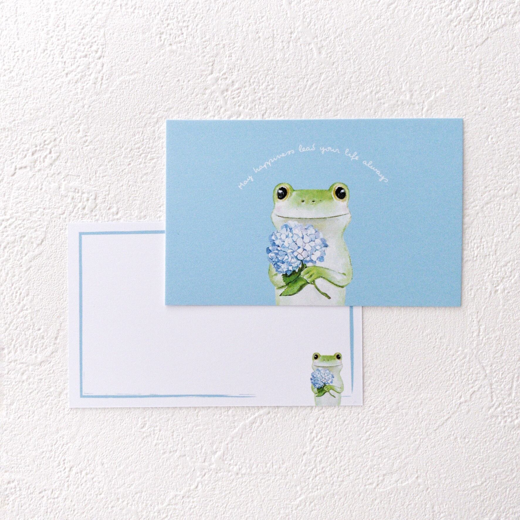 紫陽花を抱えてニッコリと微笑むカエルのメッセージカードです。